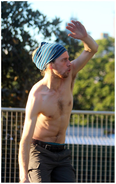 Natural sag. Until today I assumed that's what happened to people of a certain age as a result of gravity. It's the stuff that makes plastic surgeons smile, or so I thought. Apparently not. Natural sag is what slackliners look for in the terrain. James - who it has to be said displayed no sag at all - explained it to me. You seek two nice big trees a fair distance apart with a nice big dip between them. Find that and you have a perfect spot to secure your line. You don't have to climb uncomfortably high up the tree to anchor the rope but still have a nice big hollow under the rope to allow the movement you need to perform tricks. It's amazing the things you learn when you stop and talk to strangers. The line James had strung up at Musgrave Park today is a rodeo rope. I now know that a rodeo rope is a REALLY slack slackline. Where a tightrope is taut, the rodeo rope is just the opposite - it has LOTS of give. James told me that the aim of the rodeo rope is to learn to move your weight and centre of gravity so that you can effectively surf on the rope.This made perfect sense - to the girl with both feet, her bum, her dog and all her natural sag on the ground. Some times I think being a bit slack is perfectly called for in the circumstances.